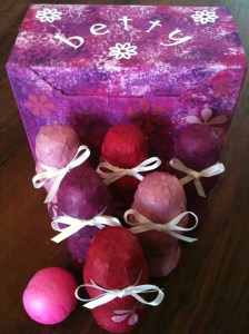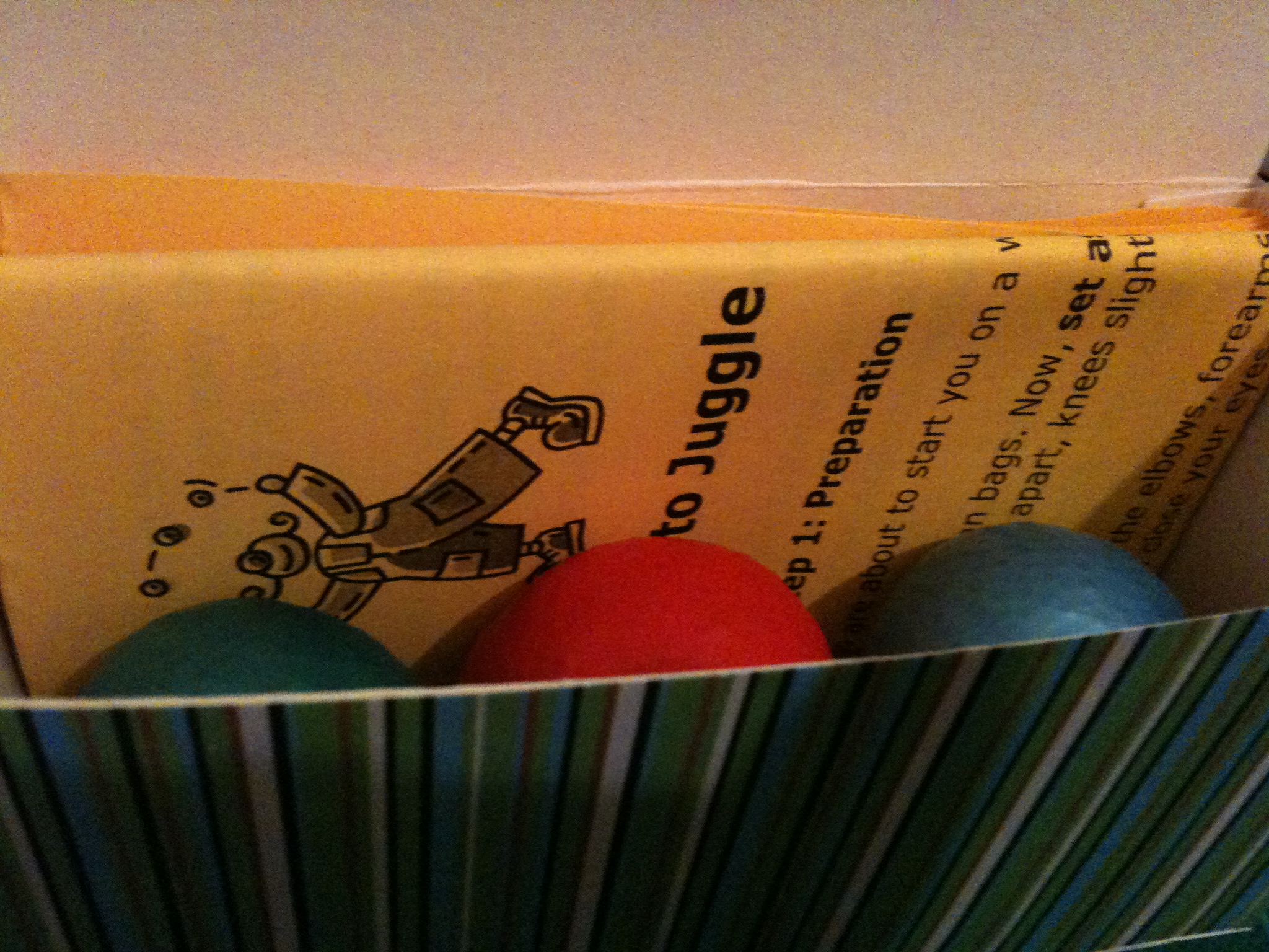 To make up a  juggling ball kit I put three balls inside an old tea bag box which I covered in patterned paper, and added a set of instructions printed from the internet.