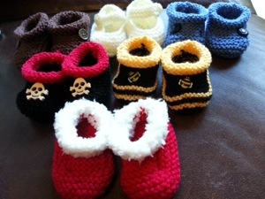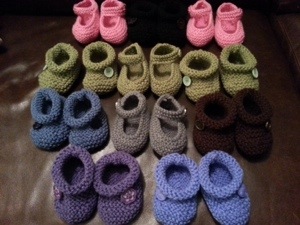 Until a few months ago, if anyone asked what I was knitting, the answer was almost certain to be “booties.” I first started with three colours – pink Mary-Janes for girls, blue boots for boys and brown boots for the unisex option. But I’ve since knitted them in lots more colours – quite a lot of green and cream, different shades of blue and pink, purple, dark brown, and even black.